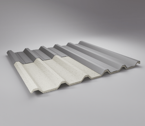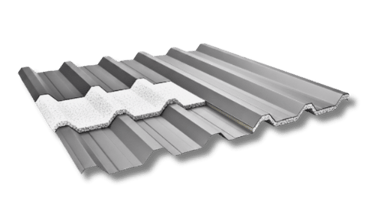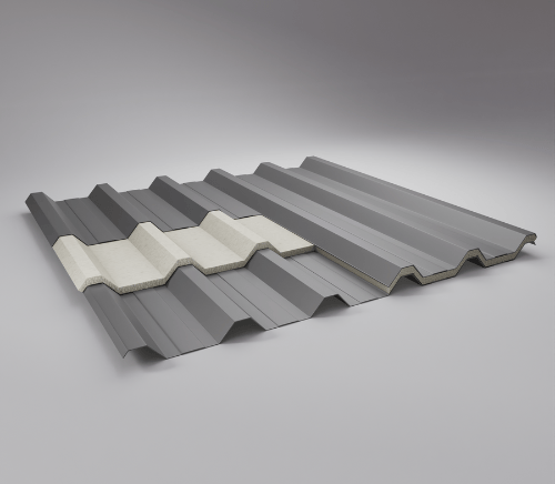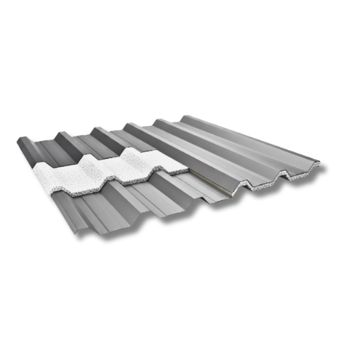 A telha semi-sanduíche é formada por uma chapa metálica superior e uma camada de material isolante (EPS) aplicada na parte inferior. Oferece uma excelente melhoria térmica e acústica, sendo uma opção de ótimo custo-benefício para reduzir o calor e o barulho.